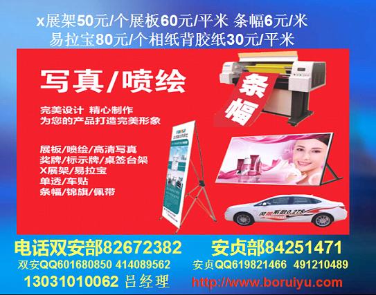 易拉寶100元/個,x展架60元/個,相紙40元/平米,背膠PP紙35元/平米,展板70元/平米,曬藍圖1元起、硫酸圖2元起、CAD出圖工程圖紙復印0.5元起。條幅8元/米起價、錦旗90元/個。彩頁157銅版紙1000張300元,畫冊8P1000本1.80元、手提袋1000個/2.80元、無碳復寫32開200本6.50元/本